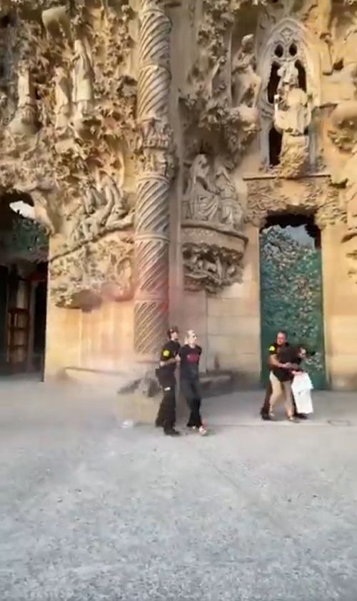 스페인 환경단체 ‘미래 식물’ 소속 환경운동가들이 31일(현지시간) 건축가 안토니오 가우디가 설계한 바로셀로나의 성당 ‘사그라다 파밀리아’ 기둥과 벽면에 페인트를 뿌리디가 경찰에 체포되고 있다. X 캡처 |