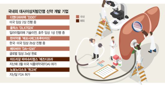 국내 기업 중 디앤디파마텍(347850)은 글루카곤유사펩타이드(GLP)-1 계열의 MASH 신약 ‘DD01’의 미국 임상 2상을 진행 중이다. DD01은 임상 2상 중간 결과에서 간 내 지방을 30% 이상 줄일 수 있다는 효과를 확인했다. DD01 투약군에서 12주차 평균 지방간 감소율은 62.3%로 위약군 평균(8.3%) 대비 우수했다. 디앤디파마텍은 이러한 결과를 바탕으로 글로벌 기술이전을 추진하고 있다.