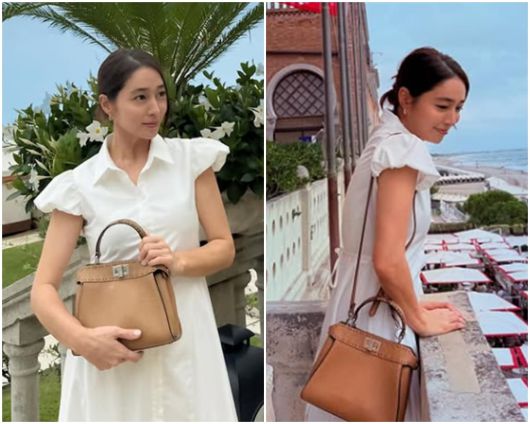미니 피카부백은 명품 브랜드 F사의 제품이다. 고급스러운 브라운 컬러에 양측면에 아이코닉 트위스트 락 장식이 달려있어 매력적이다. 하객룩이나 오피스룩에 제격인 이 피카부백은 무려 720만원을 호가한다.
