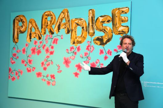 미국 팝아트 작가 조엘 메슬러가 1일 인천 중구 파라다이스시티 아트스페이스에서 열린 국내 첫 개인전 파라다이스 파운드(Paradise Found) 사전 공개 행사에서 작품 ‘파라다이스 위드 블로섬스(Paradise with Blossoms)’를 소개하고 있다. (사진=연합뉴스) |
