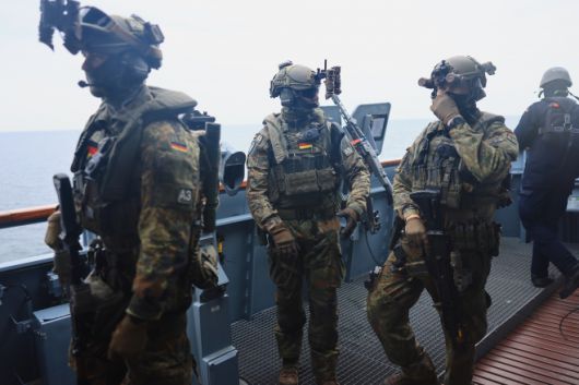 독일 로스토크 인근 독일 해군의 프리깃함 바이에른(바바리아)에서 병사들이 갑판 위를 걷고 있다. 2025.8.28 EPA 연합뉴스 |