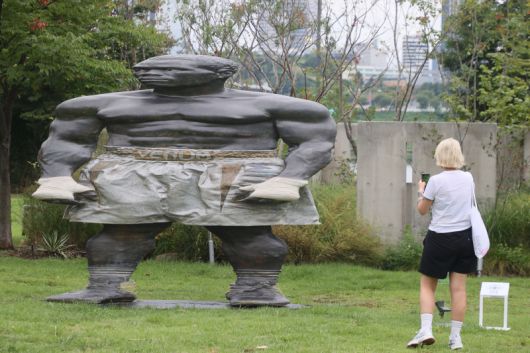 1일 서울 뚝섬한강공원에서 열린 서울조각페스티벌에서 방문객들이 전시된 조각 작품들을 살펴보고 있다. |