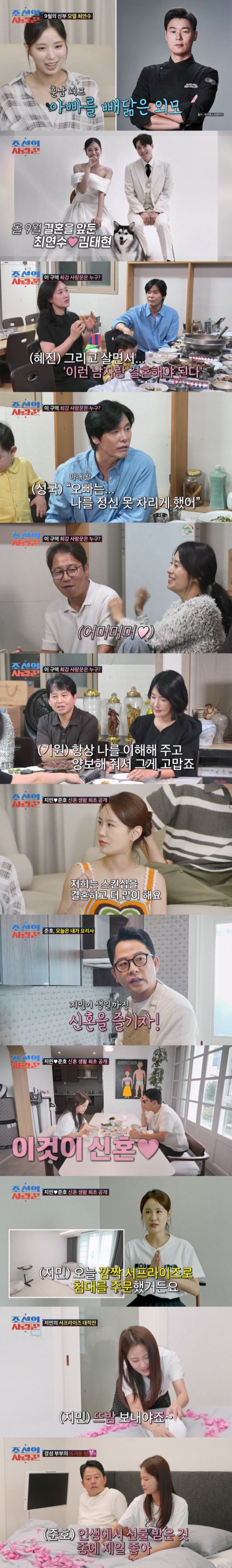 점점 분위기가 무르익자 이들은 서로의 배우자 자랑을 이어갔다. 둘째 임신 5개월 차인 최성국 아내 안혜진은 “항상 잘해준다. ‘이런 사람이랑 결혼해야 한다’라는 말이 있는데 그걸 남편을 보면서 많이 느낀다”고 전해 신혼 19주 차인 심현섭, 정영림 부부의 부러움을 자아냈다.