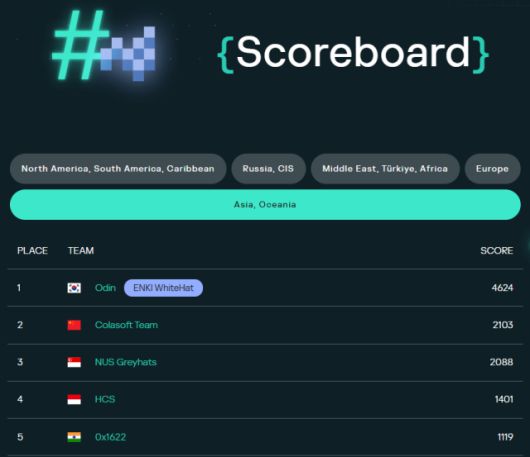각 지역 우승팀에게는 '시큐리티 어낼리스트 서밋(Security Analyst Summit·SAS) 2025 CTF' 본선 진출 자격이 주어진다. 이번 우승으로 오딘팀은 오는 10월 태국에서 열리는 SAS CTF 본선 진출권을 획득했다. 엔키화이트햇의 오딘팀은 암호학, 리버스 엔지니어링, 웹 취약점, AI 보안 등 다양한 영역에서 출제된 실전 기반의 과제를 해결하며 총 4624점을 획득했다.