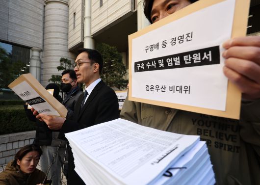 지난해 11월 티몬·위메프(티메프)의 대규모 미정산 사태와 관련해 구영배 큐텐그룹 대표, 류광진 티몬 대표, 류화현 위메프 대표의 구속 전 피의자 심문(영장실질심사)이 열리는 서울 서초구 서울중앙지방법원에서 티메프 피해 판매자·소비자 연합인 검은우산비상대책위원회 관계자들이 경영진 구속 수사 및 엄벌을 촉구하고 있다. [연합] |