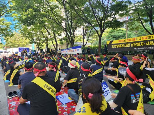 2023년 9월 8일 서울 여의도 한국거래소 앞에서 이화그룹주 소액주주연대가 ‘이화그룹주 거래 중지 해제 촉구 집회’를 열고 있다. /조선비즈DB |