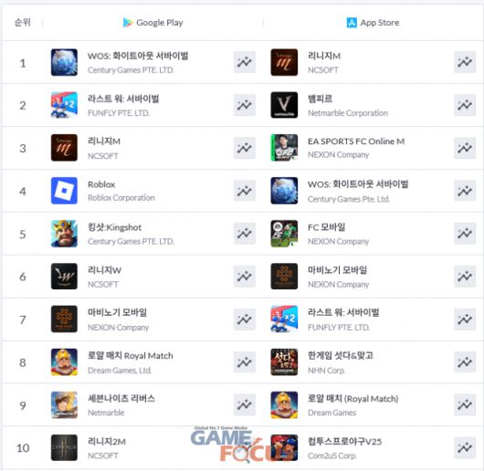 구글 플레이에서는 '로블록스'와 '킹샷', '리니지W'와 '마비노기 모바일'의 순위가 서로 바뀌었을 뿐 TOP 10 내 이름을 올리고 있는 게임들이 지난 주와 동일하다. 순위 집계가 아직 이루어지지 않아 넷마블이 출시한 '뱀피르'가 몇 위에 오를지는 미지수이나, 애플 앱스토어에서 1위를 차지하는 등 초반 흥행 분위기가 조성된 만큼 TOP 10 내에 무난히 입성할 수 있을 것으로 전망된다.