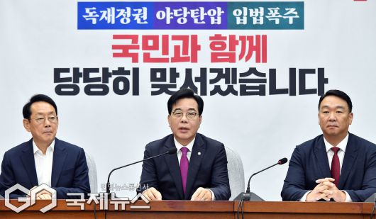 (서울=국제뉴스) 송언석 국민의힘 원내대표가 2일 오전 국회에서 열린 원내대책회의에서 발언 하고 있다./사진=이용우 기자