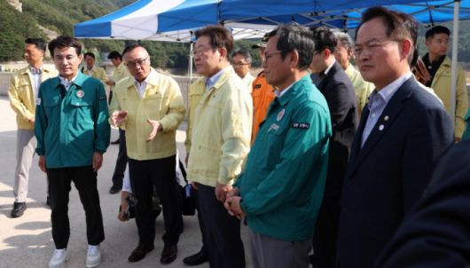 이재명 대통령이 지난달 30일 강원 강릉시 성산면 오봉저수지를 찾아 가뭄 대책을 듣고 있다. 왼쪽부터 김진태 강원도지사, 황주호 한국수력원자력 사장, 이 대통령, 김홍규 강릉시장, 허영 더불어민주당 의원./사진=뉴시스 |
