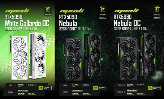 라인업은 화이트 감성을 강조한 Manli 지포스 RTX 5090 Gallado OC 32GB White, 게이밍 환경을 겨냥한 Manli 지포스 RTX 5090 Nebula 32GB, 극한 성능에 초점을 둔 Manli 지포스 RTX 5090 Nebula OC 32GB로 나뉜다.