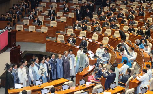 1일 서울 여의도 국회 본회의장에서 열린 제429회 정기국회 개회식에 민주당 의원들은 한복을. 국민의힘 의원들은 근조 리본을 달고서 상복차림으로 참석했다. 장승윤 기자 tomato99@donga.com |