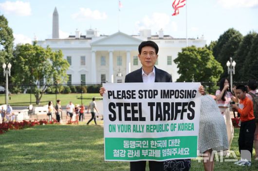 [포항=뉴시스] 송종욱 기자 = 이강덕 경북 포항시장이 1일(현지 시각) 워싱턴 D.C. 백악관 앞에서 '철강 관세 인하 촉구' 1인 시위를 전개하고 있다. 사진은 1인 시위를 벌이는 이강덕 포항시장. (사진=포항시 제공) 2025.09.02. photo@newsis.com |