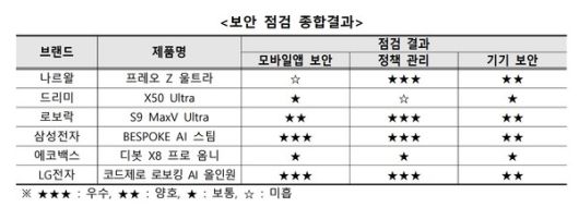 또 삼성전자, LG전자 2개 제품이 접근 권한 설정, 불법 조작 방지 기능, 안전한 패스워드 정책, 업데이트 정책 등이 비교적 잘 마련돼 종합적인 평가에서 상대적으로 우수했다.