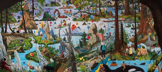 ‘몽유도원도’를 연상시키는 동양화적 구도에 서양화의 표현기법과 레퍼런스를 차용한 점도 눈길을 끈다. ‘Trip West’ 좌측 하단에 그려진 나무 옆에서 풍경을 내려다 보는 여인은 카스바르 다비트 프리드리히의 1818년작 ‘Chalk Cliffs on Rügen’에서 가져왔다. 또 구불구불한 뱀 형태의 모양에 뱀 머리 대신 촛불이 그려진 형상은 르네 마그리트의 1930년대 회화 ‘The Return of Nature’를 오마주한 것이다.