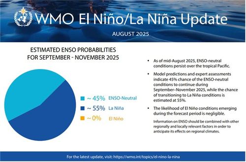 2일 기상청에 따르면 WMO는 이날 발표한 엘니뇨·라니냐 전망에서 9∼11월 라니냐가 발생할 확률을 55%, 라니냐도 엘니뇨도 발생하지 않은 '중립'이 유지될 확률을 45%로 제시했다.