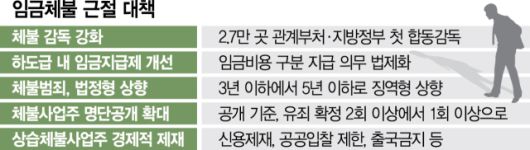 고용노동부는 2일 관계부처와 이 같은 내용을 골자로 한 임금체불 근절 대책을 발표했다. 김영훈 노동부 장관은 “임금체불은 노동자와 그 가족의 삶을 위협하는 임금 절도”라며 “오늘 대책은 ‘온 나라가 임금체불을 반드시 줄인다’는 정부의 강력한 의지”라고 말했다.