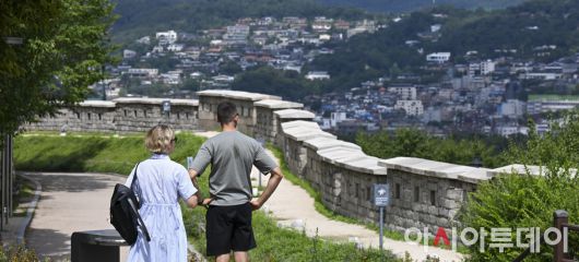 2일 서울 종로구 낙산공원 성곽길에서 외국인 관광객들이 넷플릭스 애니메이션 영화 '케이팝 데몬 헌터스'에서 주인공 루미와 진우가 데이트했던 장소를 찾아 둘러보고 있다. /정재훈 기자 |