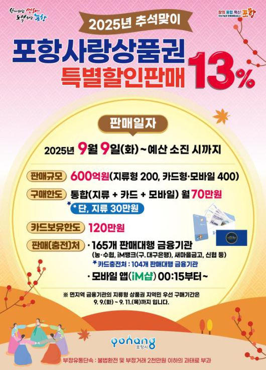 ‘포항사랑상품권 특별 할인 판매 13%’ 홍보 포스터. [사진=포항시] |