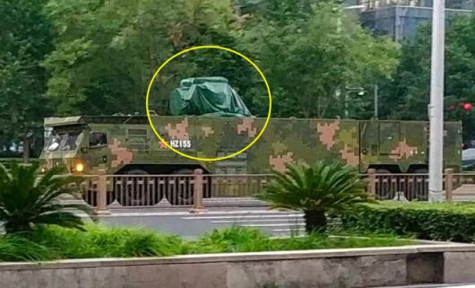 방수포에 가려진 채 모습을 드러낸 중국의 레이저 무기. 소셜미디어 캡처 |