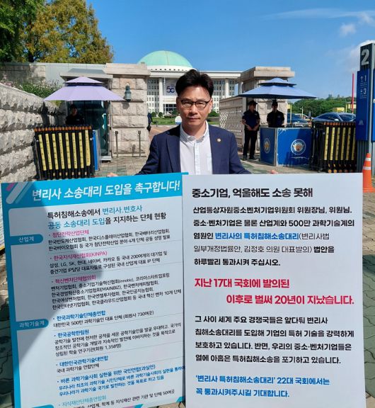 이날 1인 시위에 나선 김두규 회장은 “변리사법 개정안이 국회에 발의된 지 올해로 20년째”라며 “이번 22대 국회에서는 꼭 변리사법 개정안이 국회를 통과해 과학기술계와 산업계의 오랜 숙원이 해결되길 바라는 마음에서 국회로 나왔다”고 밝혔다.