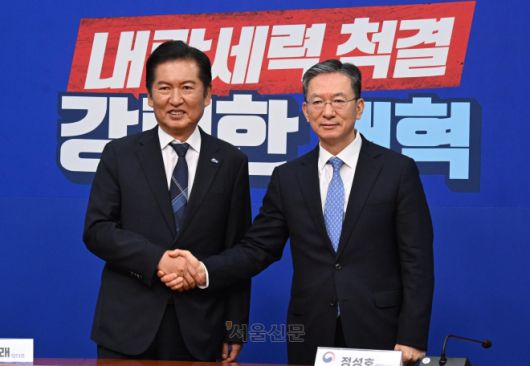6일 정청래 더불어 민주당대표가 국회에서 정성호 법무부장관을 접견 하고 있다. 안주영 전문기자 |