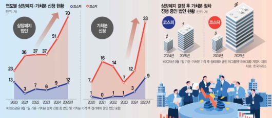 앞서 올해 1월 금융 당국과 거래소는 상폐 제도 개편안을 발표했다. 시가총액과 매출 요건을 대폭 상향하고, 감사 의견이 2년 연속 비적정일 경우 즉시 상폐되도록 했다. 개선 기회는 1회로 제한됐으며 코스닥 퇴출 심사 절차도 기존 3심제에서 2심제로 축소됐다. 거래 정지 장기화를 줄이고 시장 신뢰를 높이겠다는 취지다. 이에 따라 올 들어 거래소가 상폐를 결정한 기업(정리매매 중인 기업 포함) 수는 총 82곳(코스피 12곳·코스닥 70곳)으로 △2023년 코스피 6곳·코스닥 37곳 △2024년 코스피 9곳·코스닥 51곳 대비 크게 늘어났다.
