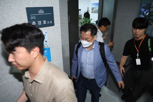 12·3 비상계엄 관련 내란·외환 의혹을 수사하는 내란 특검팀(특별검사 조은석) 수사관들이 2일 오후 서울 여의도 국회 추경호 의원실에서 압수수색을 마친 후 의원실을 나서고 있다. /뉴스1 |