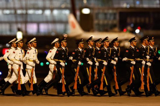 2일 베이징에 중국 전승절 행사 참석을 위해 각국 정상들이 속속 도착하고 있는 가운데 콩고 공화국의 대통령 드니 사수 응게소가 베이징 수도 국제공항에 도착하자 의장대원들이 사열을 위해 달려가고 있다. AFP연합뉴스 |