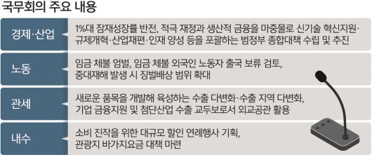 이 대통령은 경제·산업 분야에서 적극재정 및 생산적 금융을 마중물로 한 성장 대책을 수립해야 한다고 강조했다. 장기간 하락세를 이어온 잠재성장률을 반전시킬 계기를 금융정책으로 모색해야 한다는 취지에서다.