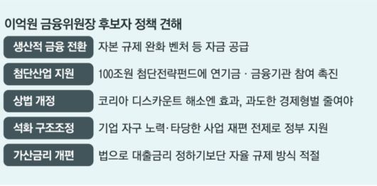 이 후보자는 상법 개정과 관련해서도 배임죄 등 경제형벌을 완화해 기업 부담을 줄여야 한다는 뜻을 피력하는 등 시장 친화적인 발언을 내놓아 시장에선 향후 제도 변화에 따른 금융권 충격을 완화해줄 것이라는 기대도 나온다.