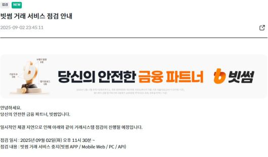 빗썸은 "점검 완료 후 국내외 거래소 시세와 빗썸 호가 간 비정상적인 차이가 발생할 경우 고객 보호 차원에서 대기 주문이 취소될 수 있다"며 "서비스 점검 전 매수·매도 주문을 취소해 달라"고 안내했다.