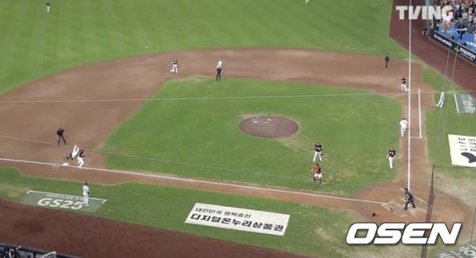 그런데 번트 수비를 위해 내야 잔디 앞으로 나와 있던 3루수 윤도현이 베이스를 밟지 않고 베이스 앞에서 공을 잡아 2루주자를 태그 아웃 시도했으나 세이프 됐다.