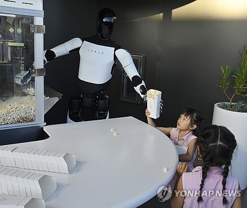 8월21일 미 LA '테슬라 다이너'에서 아이들에게 팝콘 건네는 로봇 옵티머스 |