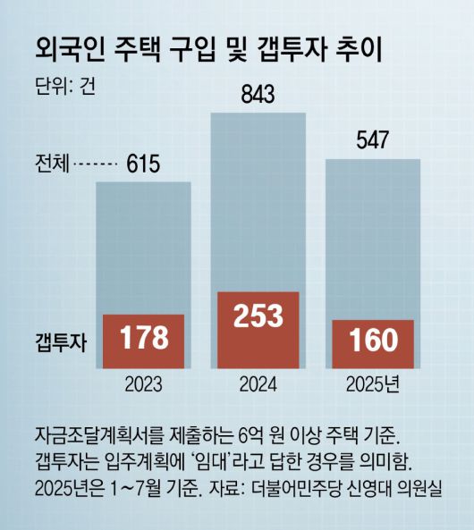 국회 국토교통위원회 소속 더불어민주당 신영대 의원실이 국토교통부에서 확보한 외국인 자금조달계획서 등에 따르면 2023년부터 2025년 7월까지 계약한 2005건 중 591건(29.5%)이 입주계획에 ‘임대’라고 답한 것으로 나타났다. 12억 원 이상 고가 주택의 경우 자금조달계획서 700건 중 231건(33%)이 전월세를 주겠다고 밝혔다. 외국인이 국내 주택을 매입할 때 주택 가격이 6억 원 이상이거나 투기과열지구, 조정대상지역 내 주택은 모두 자금조달계획서를 제출해야 한다.