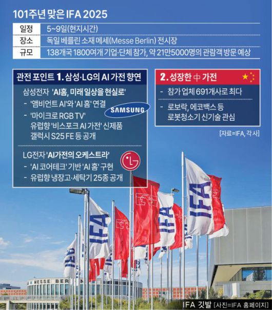 5일(현지시간)부터 독일 베를린에서 열리는 'IFA 2025'는 삼성전자와 LG전자의 인공지능(AI) 기반 프리미엄 가전 혁신과 AI 홈 시대를 미리 보는 장이 될 전망이다.