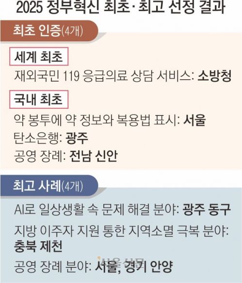 2일 서울 중구 ‘커뮤니티하우스 마실’에서 열린 ‘2025 정부혁신 최초·최고(4회)’ 인증패 수여식에서 8개 기관이 우수 사례로 선정됐다. 서울시, 신안군과 함께 소방청의 ‘재외국민 119 응급의료 상담 서비스’와 광주시의 ‘탄소은행’이 최초 인증을 받았다. 최고 부문에서는 충북 제천시(지방 이주자 지원) 등 4개 기관이 인증패를 받았다.