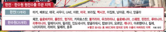 이에 한전은 미국·아랍에미리트(UAE)·베트남 등 13개국, 한수원은 체코와 루마니아, 필리핀, 캐나다 등 25개국을 맡아 수주 활동을 펼쳐 왔다. 한국형 원전을 그대로 쓸 수 있는 국가는 한전이 담당하고, 설계 변경이 필요한 국가는 한수원이 주도하는 방식이다.