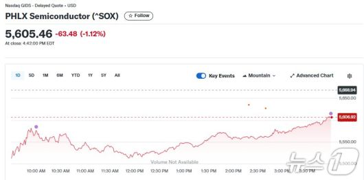 2일(현지 시각) 뉴욕증시에서 반도체지수는 1.12% 하락한 5605.46포인트를 기록했다.