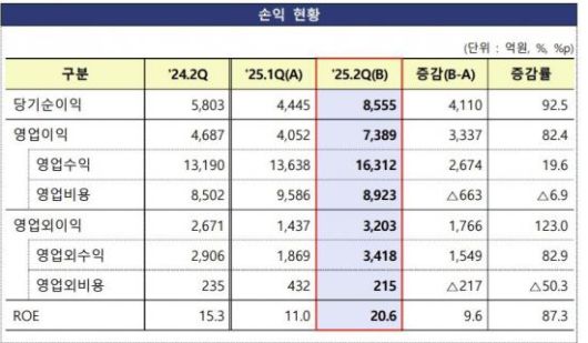 자산운용사의 당기순이익은 8555억원으로 전분기 대비 4110억원(92.5%) 늘었다. 영업수익은 1조6312억원으로 수수료수익, 증권투자손익 증가 등으로 인해 2674억원(19.6%) 증가했다. 자기자본이익률(ROE)은 20.6%로 전분기 대비 9.6%포인트 증가했다.