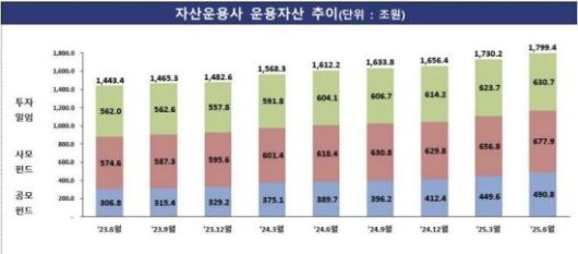 3일 금융감독원이 발표한 '2025년 2분기 자산운용회사 영업실적(잠정)'에 따르면 올해 2분기 자산운용사(500곳)의 운용자산은 1799조4000억원으로 3월 말 1730조2000억원 대비 69조2000억원(4.0%) 증가했다.