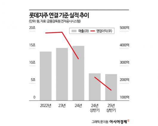 문제는 계열사들의 실적 부진이 이어져 롯데지주의 돈줄이 줄어들고 있다는 점이다. 순수 지주사인 롯데지주는 계열사들로부터 받는 배당금과 브랜드 사용료(로열티)와 경영 자문료, 이자 등이 주요 수입원이다. 올해 상반기 롯데지주 별도 기준 매출액은 2195억원으로 지난해 같은 기간 2317억원에서 120억원(8%)가량 줄었다. 핵심 자회사들의 실적이 줄줄이 미끄러진 탓이다.