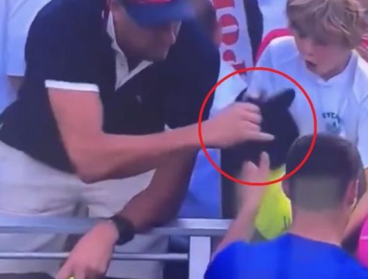 28일 US오픈에서 폴란드 테니스 스타 카밀 마이흐르작이 어린이 팬에게 건넨 모자를 뺏어가는 남성. 출처=엑스(X·옛 트위터) |