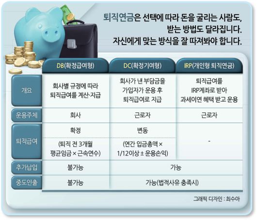 퇴직연금은 퇴직금을 금융회사에 맡겨서 굴렸다가, 퇴직할 때 연금이나 일시금으로 받는 제도를 말해요. 크게는 DB형, DC형, IRP(개인형) 등 세 가지로 나뉩니다.