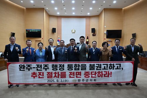 (완주=연합뉴스) 최영수 기자 = 전북 완주군의회는 3일 열린 제295회 임시회에서 서남용 의원이 대표 발의한 '완주·전주 행정통합 불권고 및 추진 절차 전면 중단 촉구 결의안'을 만장일치로 채택했다고 밝혔다.