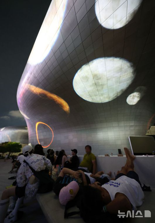 [서울=뉴시스] 조성우 기자 = 28일 오후 서울 중구 동대문디자인플라자(DDP)에서 열린 '서울라이트 DDP 2025 가을'을 찾은 시민들과 외국인 관광객들이 미디어파사드 작품을 관람하고 있다. 해당 미디어 파사드는 오픈AI 지원으로 영상 생성 플랫폼 '소라(Sora)'를 활용해 제작한 티모 헬거트의 '문 사이클'. 2025.08.28. xconfind@newsis.com |