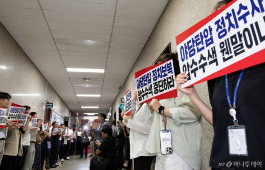 (서울=뉴스1) 이승배 기자 = 내란 특검팀이 비상계엄 해제 요구 결의안 표결 방해 의혹을 받는 추경호 국민의힘 의원에 대한 강제수사에 착수, 자택 및 원내대표실 등을 압수수색한 2일 서울 여의도 국회 국민의힘 원내대표실 앞에서 직원들이 압수수색을 규탄하는 피켓팅을 하고 있다. 2025.9.2/뉴스1 Copyright (C) 뉴스1. All rights reserved. 무단 전재 및 재배포, AI학습 이용 금지. /사진=(서울=뉴스1) 이승배 기자 |