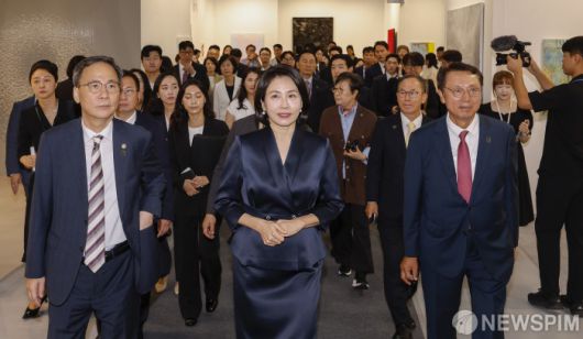 [서울=뉴스핌] 정일구 기자 = 이재명 대통령 부인 김혜경 여사가 3일 오전 서울 강남구 코엑스에서 열린 '키아프 서울 2025' 페어 투어 행사에서 전시 작품들을 관람하고 있다. 2025.09.03 mironj19@newspim.com