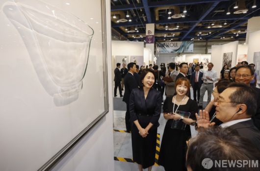 [서울=뉴스핌] 정일구 기자 = 이재명 대통령 부인 김혜경 여사가 3일 오전 서울 강남구 코엑스에서 열린 '키아프 서울 2025' 페어 투어 행사에서 전시 작품들을 관람하고 있다. 2025.09.03 mironj19@newspim.com