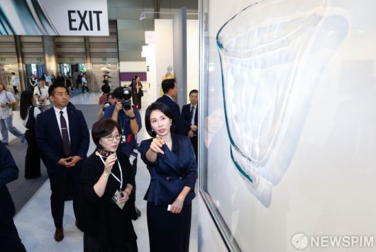 [서울=뉴스핌] 정일구 기자 = 이재명 대통령 부인 김혜경 여사가 3일 오전 서울 강남구 코엑스에서 열린 '키아프 서울 2025' 페어 투어 행사에서 전시 작품들을 관람하고 있다. 2025.09.03 mironj19@newspim.com
