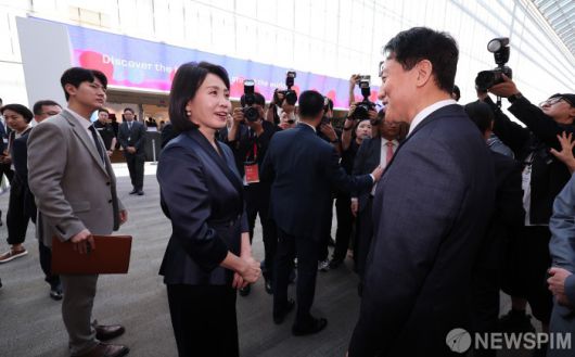 [서울=뉴스핌] 정일구 기자 = 이재명 대통령 부인 김혜경 여사와 오세훈 서울시장이 3일 서울 강남구 코엑스에서 열린 '프리즈 서울 2025' 페어 투어 행사에서 인사를 나누고 있다. 2025.09.03 mironj19@newspim.com